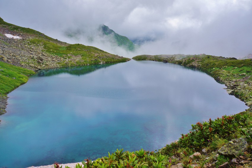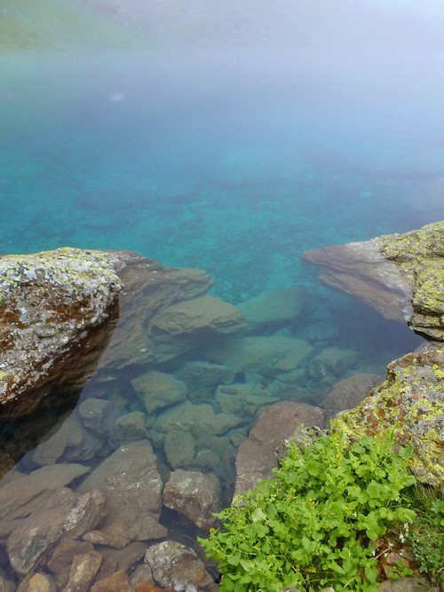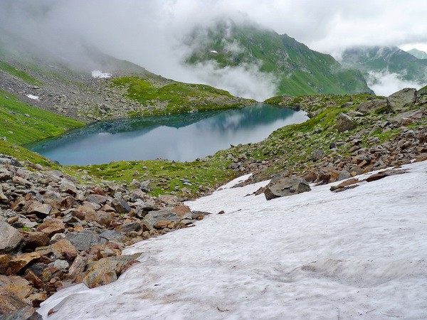Поужинали чем бог послал, то есть тем, что несли с собой и быстро уснули.А ночью были разбужены сильной грозой, пришёл циклон и на следующий день вынуждены просидеть, пролежать в палатке, поедая продукты и пару раз выбираясь в тумане, чтобы полюбоваться озером Семицветным, рядом с которым мы расположились.