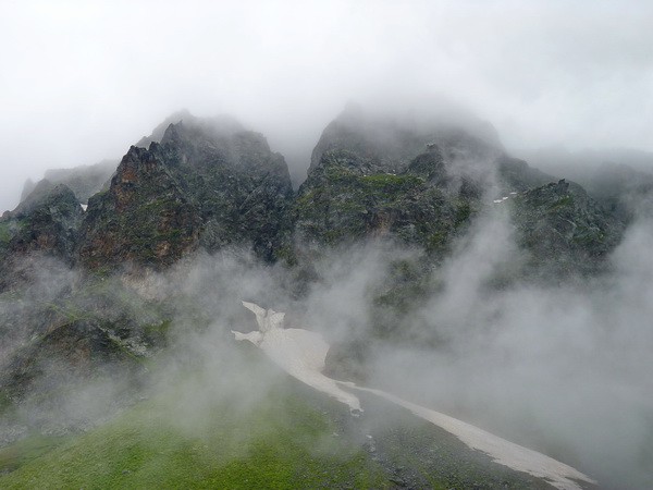 но сильный дождь заставил нас спуститься. Окружающие вершины были таинственно окутаны клоками тумана,