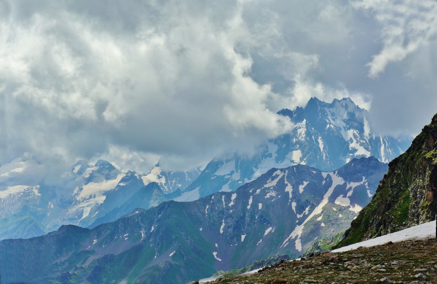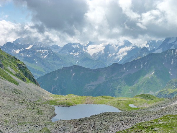 На другой стороне перевала далеко внизу сверкает ещё одна жемчужина, а прямо перед нами открываются виды на Софийский хребет( по центру) и гору Псыш( закрыта облаками справа)