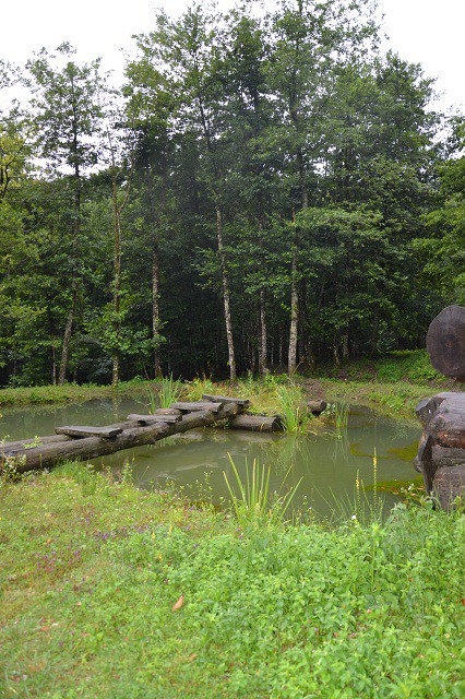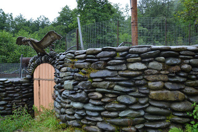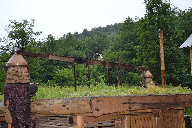 На территории комплекса находятся емкости из камней, в которых выращивают рыбу. А так же вольеры с птицей и домашними животными