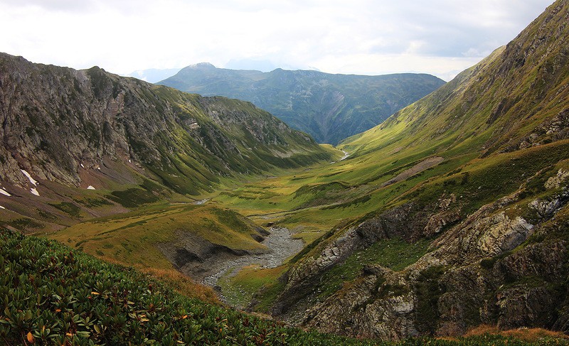 Пока наблюдалась устойчивая, солнечная погода, мы решили сходить на Псеашхо Сахарный, полюбоваться потрясающей панорамой ГКХ. Старт. Газпром. Пихты. На бзерпинском карнизе, утомленный жарой егерь проверил у нас пропуска, вяло отметив, что стоянка у второго притока Пслуха запрещена. Идем дальше
