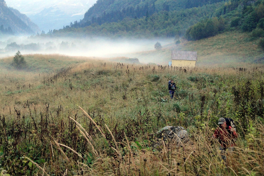 Высаживаемся из «шишиги» на заповедном домике под перевалом Аишха. 6:30 утра.