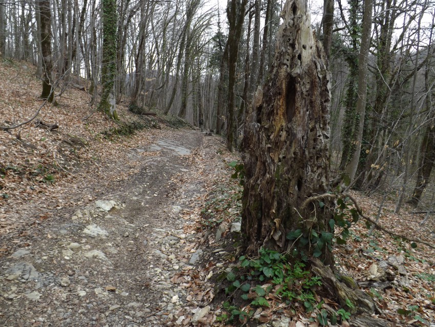 Доходим до развилки, где одна дорога уходит на спуск на 4-ю роту в район Дагомыса. Вот так, оказывается, всё близко, а на машине едется гораздо длиннее вокруг города и через Мамайский перевал! На дереве и указатель имеется, дорога как-никак:)
