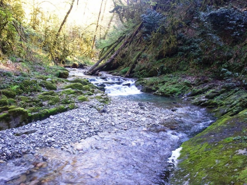 Кратко — на 102 автобусе до конечной, далее мимо Ореховских водопадов в сторону Ажека, по тропе к слиянию Сочинки и Агвы. Если пройти немного по Агве вверх, можно увидеть нижний водопад, где ручей Сванидзе впадает в Агву (мы туда не пошли, вода холодная и высокая). Если перейти Агву через мост, нужно подняться на Буковую поляну (места отдыха), с неё тропа уходит влево и выходит на ручей Сванидзе (везде есть указатели), далее по ручью вверх…