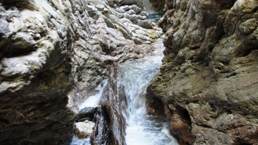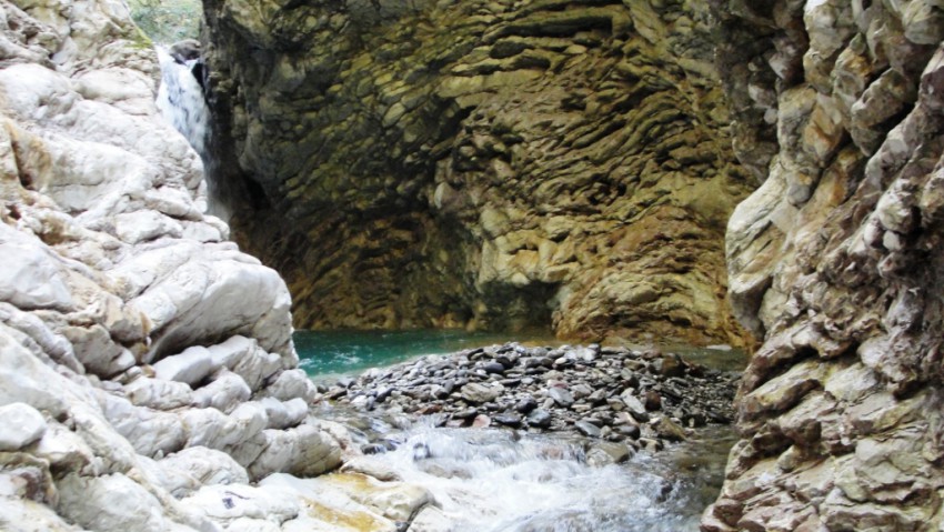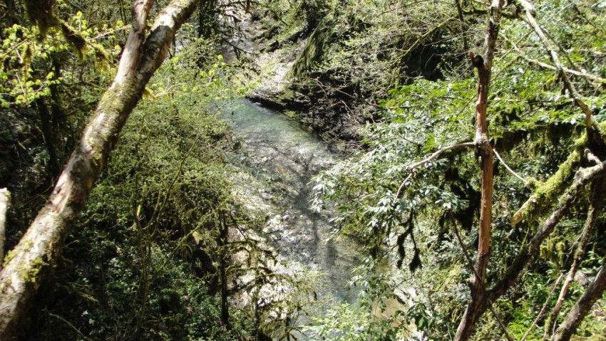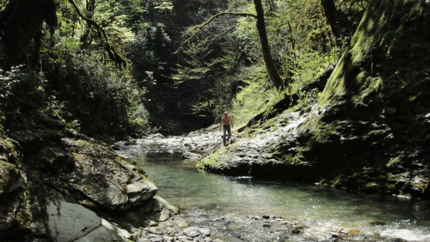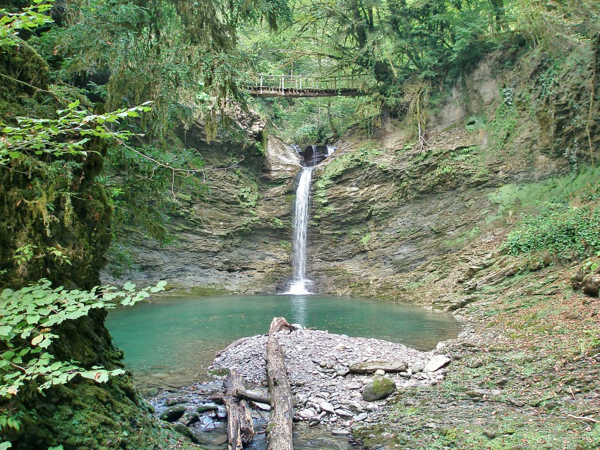 тропа пойдет плавно в низ к Ажеку. Далее, метров через 100, будет развилка (там есть хороший ориентир — скамейка для отдыха), на право в низ — это в сторону Звезды и далее к нижним водопадам, прямо — тропа выйдет на полянку, которую я описывал выше. Здесь тропа заканчивается и надо держаться правее полянки и в сторону Ажека. Спуск возможен только в одном месте, достаточно безопасен, везде очень круто. Далее по руслу реки вверх…