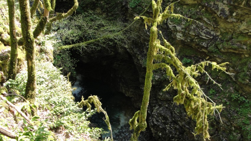 По тропе от Ореховских водопадов в сторону Ажека (везде есть информационные указатели). Когда выйдете на утес над слиянием Ажека и Сочинки,