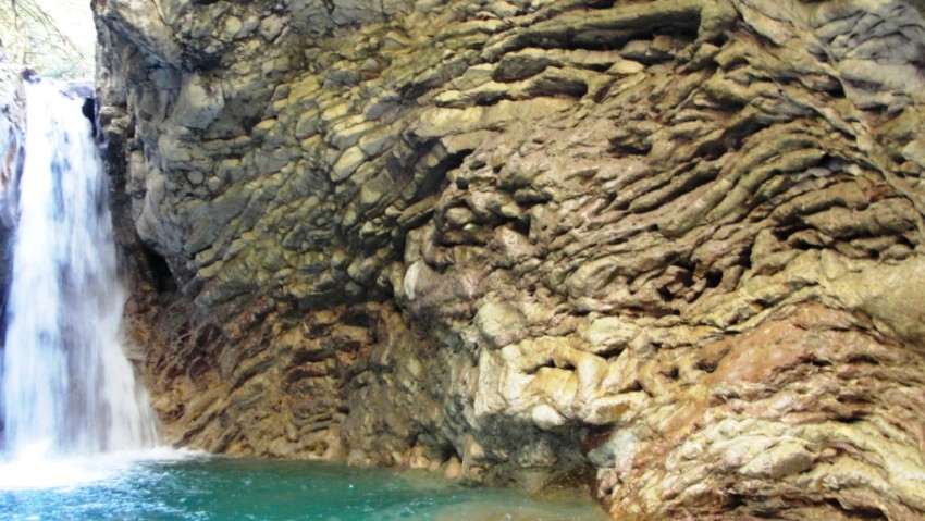 Рядом с этим водопадом в Ажек впадает приток, в октябре был пересохший. Возможно, сейчас в период высокой воды он наполнен, и «ваш» водопад на нем находится? Обрывы и трамплины на нем есть, когда воды много, водопады будут!