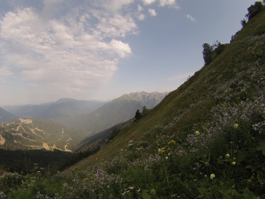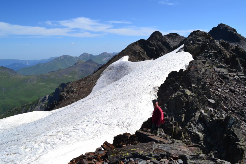 По дороге встретили ребят со сноубордами, которые решили в августе катнуть по склону Псеашхи. Там есть где, правда по времени такой спуск, конечно, будет совсем не долгим и «качество» покрова своеобразное.