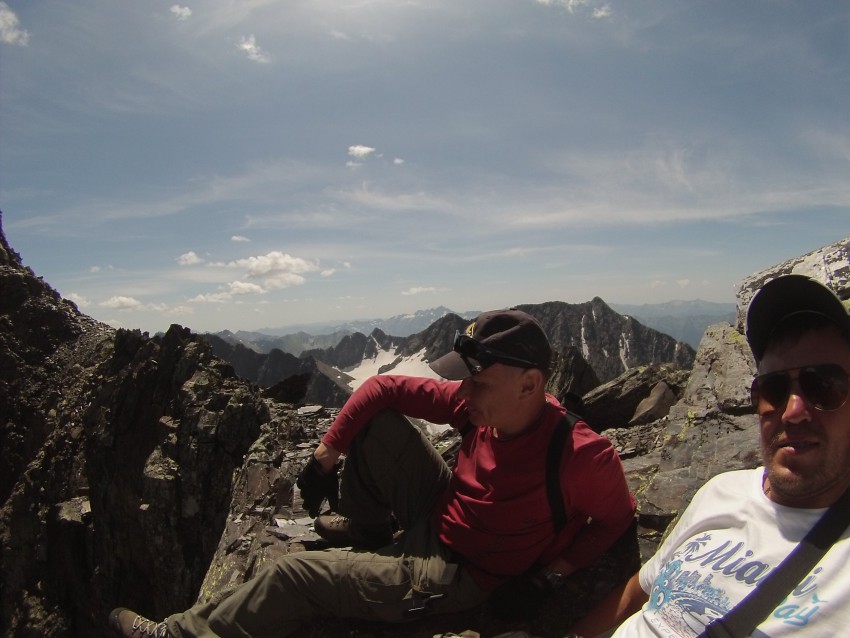 Небо ближе. Внизу, около ледника, метрах в 700-х ниже, ходили с досками в руках парни-бордеры. Видимо уже «приятная» часть (прокат) подходила к концу, а далее их ждал не такой уже приятный спуск на своих двоих вероятно по руслу 1-го притока. Мы им опять проорали приветствия, неистово размахивая руками и давая советы ))) (мне сверху видно все, ты так и знай).