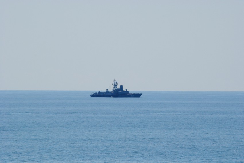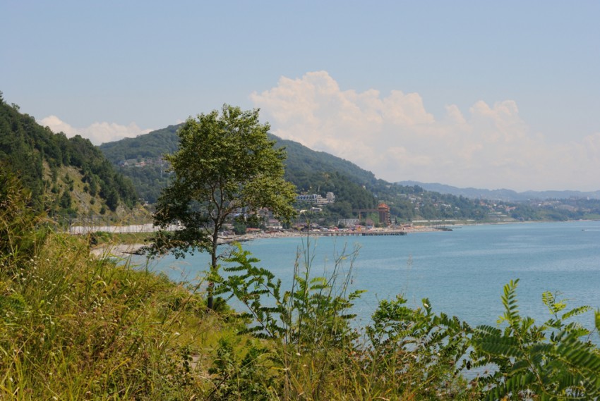 В далеке виднеется Дагомыс и Сочи, а также военный корабль, который наверно охраняет ЕГО, а наше последнее путешествие на электропоезде в Лазаревский район незаметно подходит к концу.