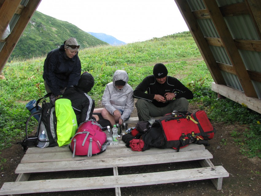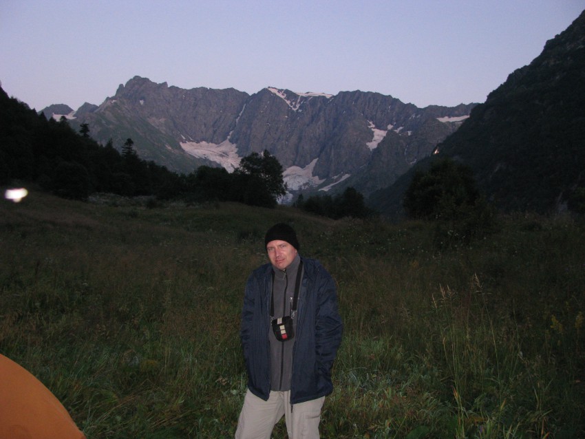 Слабый родник, пару домиков-приютов, в которых уже довольно много народу, как-то все неуютно, трава в рост, лес. Я был не в восторге. Комаров много. Но мы примяли траву-поставили палатку – место ровное.Ок. Хорошее место для трансляции с Псеашхо и Ледника.