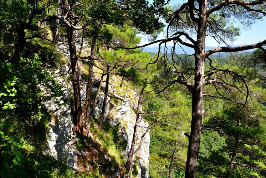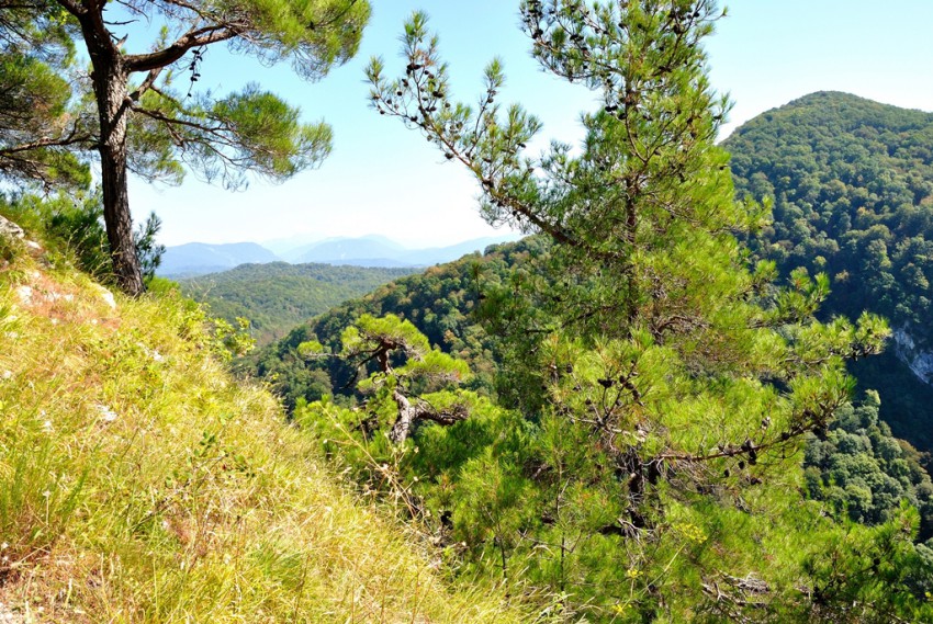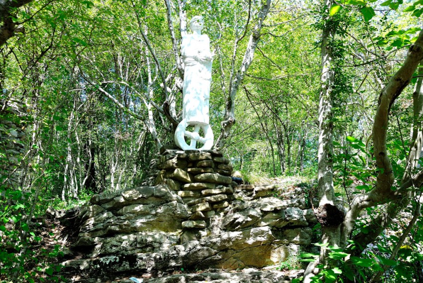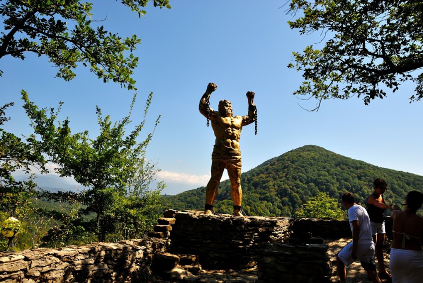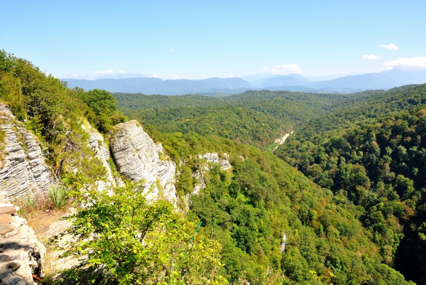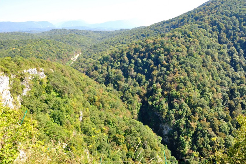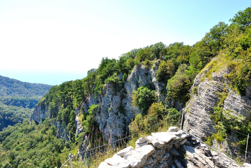 Отсюда открываеться великолепный вид на гору Ахун, реку Агуру(видно даже водопад), также очень хорошо просматриваеться Кавказский хребет, я увидел даже Скальный участок старой дороги на Красную поляну и поселок Каменку, где я уже бывал.На самой высокой точке расположена смотровая площадка, здесь же стоит статуя Прометея, которого по легенде приковали цепями к скале.Тут же есть бар и можно немного передохнуть.Дальше тропинка уходит вниз и идет также вдоль обрыва, все тоже промаркеровано, заблудиться довольно сложно.