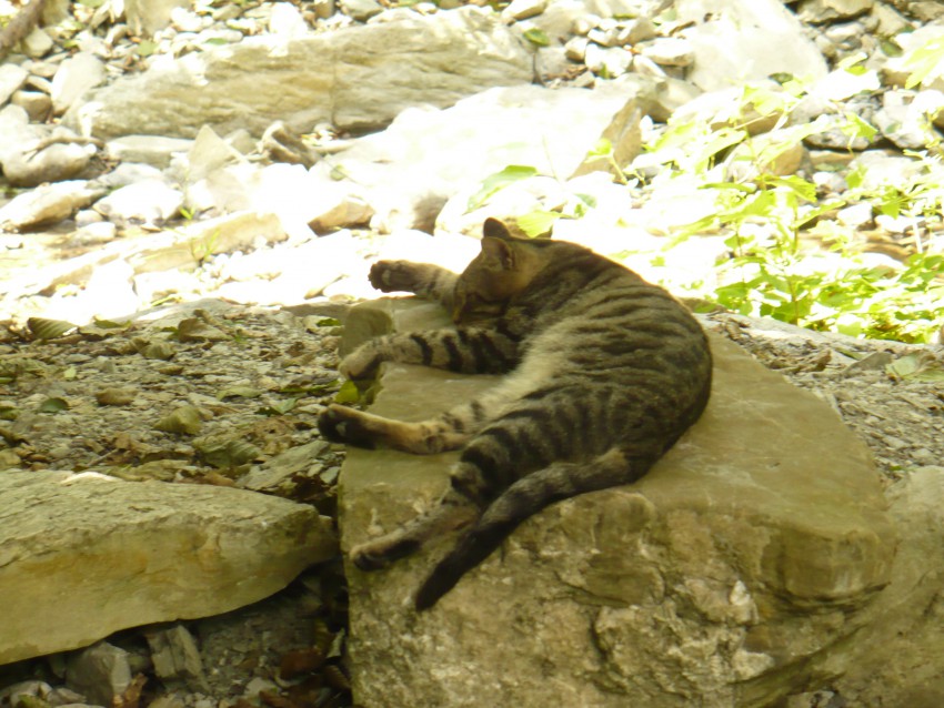 На полянке было достаточно много столиков и мангалов. Выбрав место почище решили подкрепиться, да и сумки облегчить перед походом. От речки веяло прохладой, и в жаркий день здесь было самое то. Недалеко от нас, выбрав камень повыше спал кот. Периодически он просыпался и оценивал обстановку на предмет готовности шашлыка. Подходил, получал положенную порцию и возвращался на место.