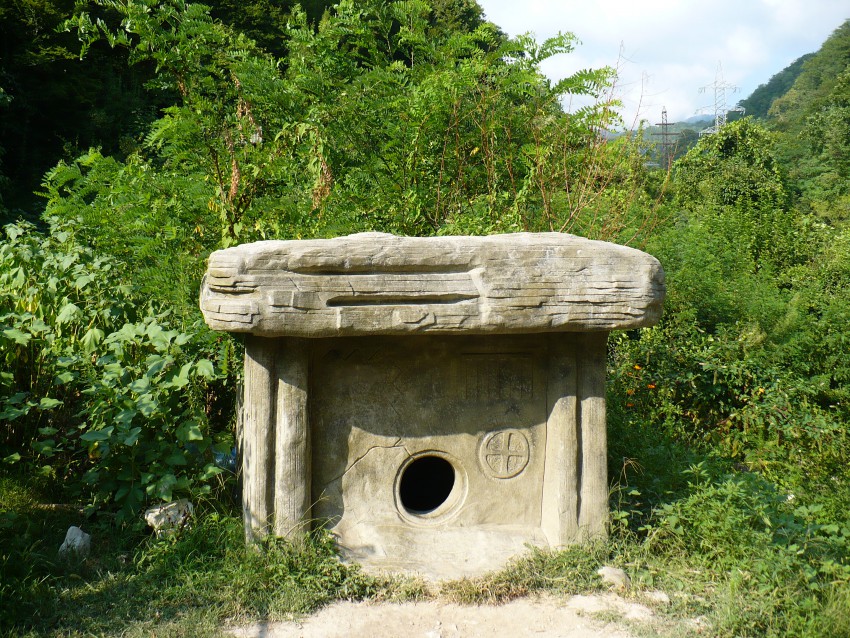 Стандартно уплатив за вход, отправились осматривать местные достопримечательности. А вот и первая — плиточный дольмен с символом «крест в круге» ( генератор удачи, хранилище и источник мощнейшей вечной энергии ). Руководством нац. парка используется как копилка. Посетители с удовольствием забрасывают внутрь монетки.