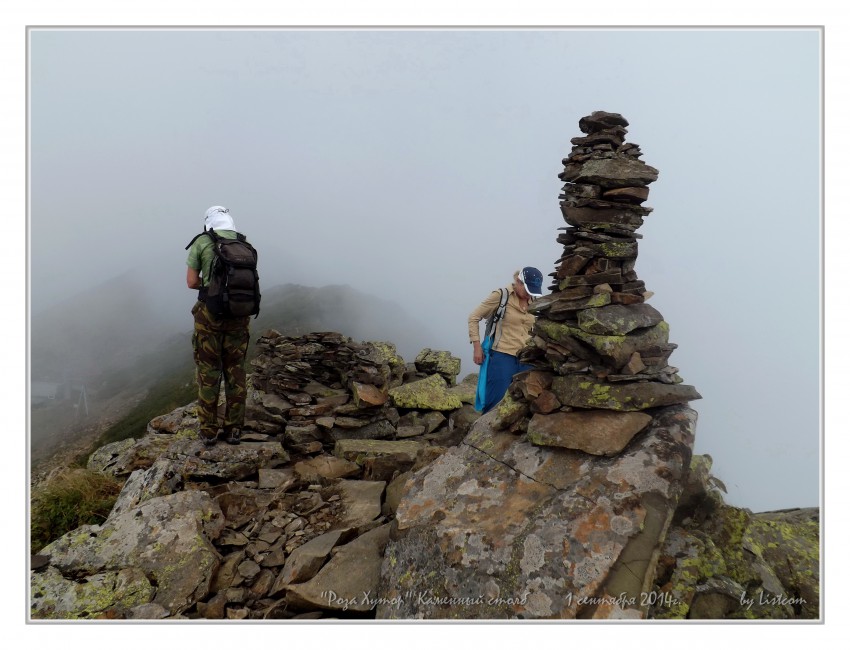 До верхней станции «Крокуса» поднялись уже в тумане. Канатка так и не работала. Еще две группы отчаянных лезли за нами в гору, не воспользовавшись подъёмником. Вот мы тренировались, а им-то зачем?))) От станции оборудовали тропку для подъёма на «якобы Каменный Столб». Настоящая вершина находится чуть дальше, но для удобства туристов её «сделали рядом». Турики наделали «туриков», в тумане смотрится очень экзотично.