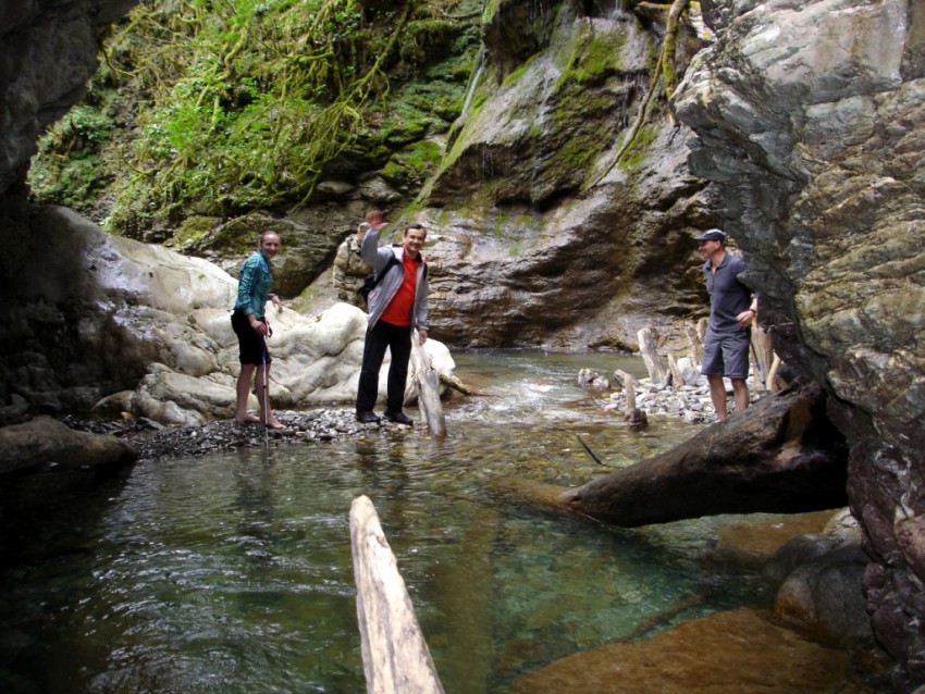 В прошлом году облазил эти места. Тропа вскоре после Верхнего Ажекского водопада исчезает и дальше проход весьма и весьма затруднён и нецелесообразен, да и за один световой день пройти таким образом, подняться на макушку Сахарной и спуститься по Прохладному просто нереально. А вот от экопоселения подняться на хребет Ажек и пройти по нему до макушки Сахарной + спуститься по Прохладному и уехать в Сочи возможно за один день возможно, но только при хорошей физической подготовке( придётся во многих местах бежать), с собой обязательно фонарик + что то очень калорийное из продуктов питания. Выезжать на первом автобусе, уезжать — на последнем. Стараться нигде не заплутать, впрочем по хребту Ажек недавно поставлены новые маркировки на деревьях.