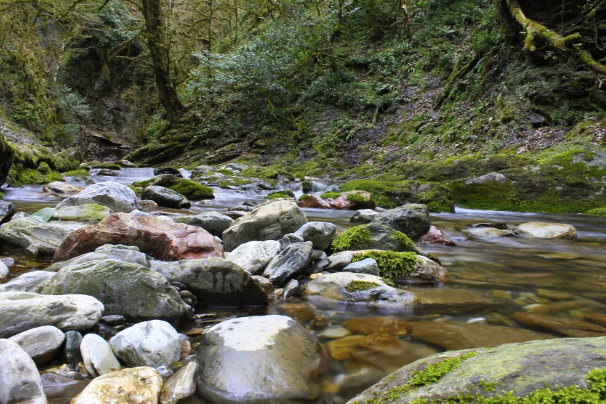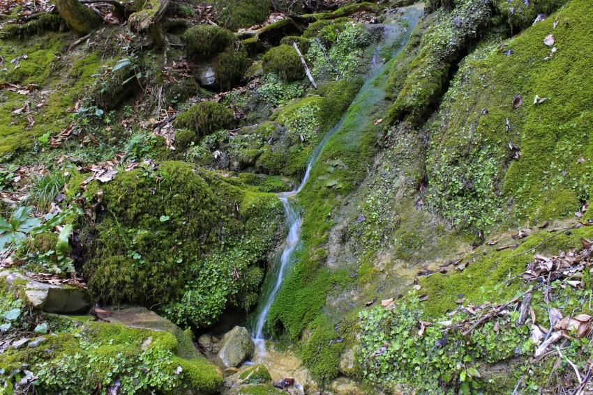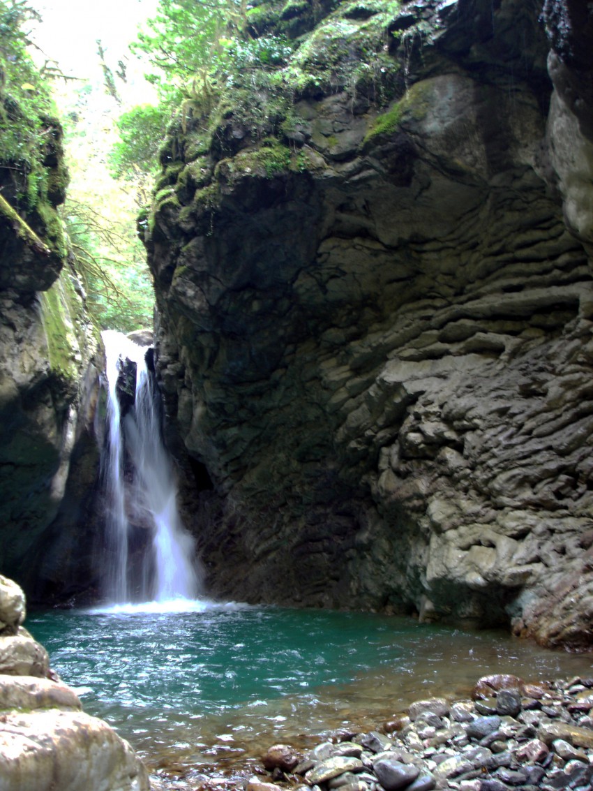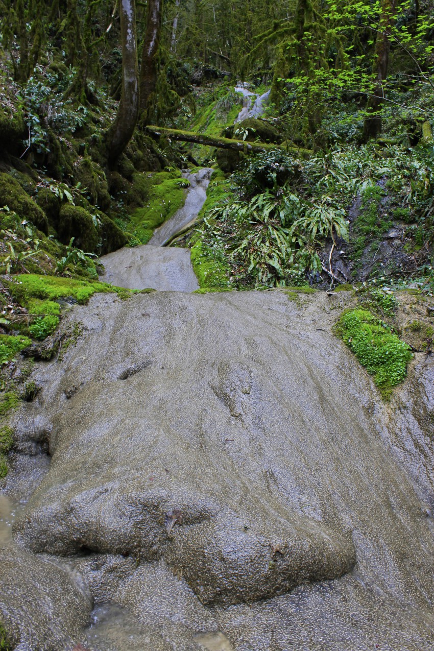 Ажечку с двух сторон обрамляют хребты Прохладный, справа от истока, и Ажек, по левому борту. Пройдя дальше по тропе, Вы пересечёте рощу грецкого ореха, и упрётесь в труднопроходимый коньон Урочище Толстый дуб. Спуститься в коньон Вы сможете, а вот выбраться на противоположный борт, будет мешать почти отвесная стена. Только в одном месте есть малозаметная и очень опасная тропка, которая через самшитник выведет Вас на высоту 838 хребета Ажек. Опасный участок на этой тропке можно преодолеть только в сухую погоду, держась за стебли рускуса. Я в эти выходные гулял там с приятелем. Ходили посмотреть водопады, которые находятся выше верхнего Ажекского. Если хотите пройти Ажекский хребет, и вернуться Прохладным одним днём, то расчитывайте свои силы на бодьше чем 17 км маршрута, с большим перепадом высот.