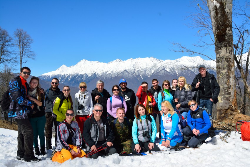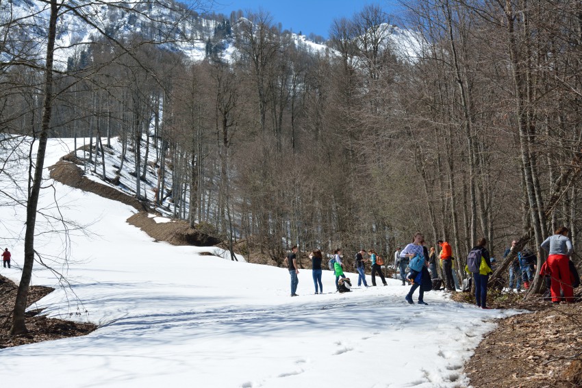 Решили мы добраться до место нашего старта на электричке, РЖД понизили тарифы на электропоезда Ласточка, проезд теперь на этом виде транспорта стал на много бюджетнее. Место старта решили обозначить жд вокзал Роза Хутор, электричка прибывала около 9 утра. Так как наш маршрут начинается ГК Горная Карусель, нам пришлось пройтись не много назад, это оказалось около 15 минут пешком. Канатка начинает работать с 9 утра, приобрели мы ски-пасс экскурсионный до высоты 960, откуда и начиналась наша пешая часть маршрута. На верху открываются прекрасные виды на горы Чугуш, Ассара, Бзерпи. До начало тропы, а точнее грунтовой дороги необходимо спустится на асфальтированную трассу и пройти метров 300 и свернуть направо, сегодня нам с погодой повезло светило солнце и в лесу было сухо. По пути придется проходить мимо горнолыжных трасс и кресельных канаток, около второй кресельной канатки будет развилка, идти надо направо в гору, в этом месте недавно сошел сель, но пройти можно спокойно. Теперь постоянно будет одна дорога без развилок, заблудится сложно, местами дорога хорошая, местами ее размыло селями. Дорога постоянно идет вверх, до самого водопада. Примерно с высоты 1100 местами появился снег, а потом наша дорога пролегала постоянно по снегу, высота снежного покрова на верху было около 1 метра. Так как в этом году у нас зима не много подзадержалась водопада «Штаны» нам не удалось посмотреть, был водопад «Шорты», водопада не оказалось на месте, слишком еще на верху холодно, но нас это не расстроило, мы совершали замечательную прогулку. Под водопадом сделали перекус, приняли солнечные ванны. и вышли в обратный путь, на обратном пути народ решил устроить свою олимпиаду в спортивной дисциплине «жопслей», при помощи пакетов и сидушок. Кто то тем временем лепил снеговика… у нас была настоящая зима среди весны. Спуск занял у нас на много меньше времени, чем подъем. Время в пути составило около 5 часов, а раньше приходилось тратить около 9 часов на маршрут. Совет на водопад лучше идти в конце мая или в июне, тогда он набирают свою мощь и красоту. Снизу не большой фотоотчет.