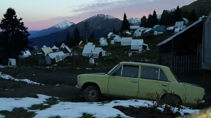 Помехой может стать дорога, но сейчас в засуху проходимость зависит только от прокладки между рулем и сиденьем. Ютуб говорит, что копейка летом-2012 поднялась, ни разу не застряла и толкать не пришлось, но машину не показывает, а лишь мотор под снятым капотом и дорогу. Подъем разной степени крутизны, но практически непрерывный! Небольшая речка (наверно, Пслушонок?) охлаждает масляные поддоны перед последним рывком, на дальнем плане хребет Аибга.