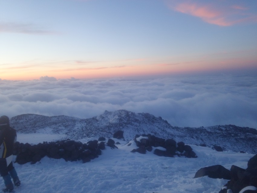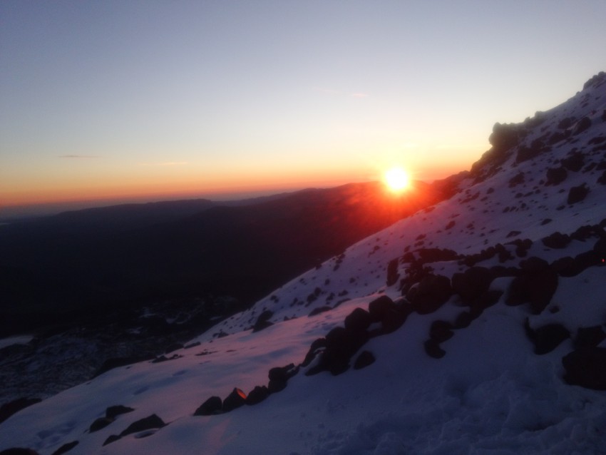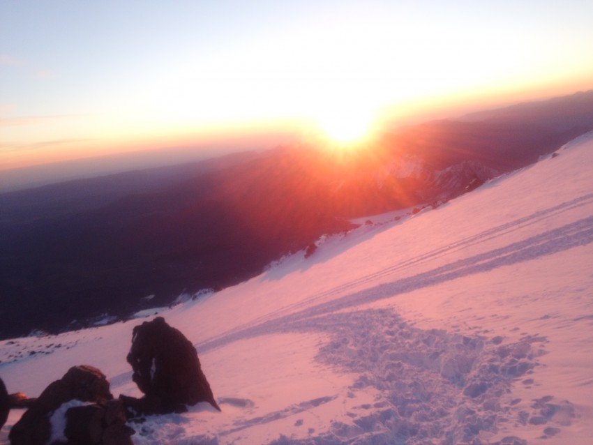 Погода пока была хорошей. Безветренной. Минус 5 где-то. Звезды светили. Очень красиво. Мы пошли в хорошем темпе. И уже через 2 часа достигли скал Ленца (отметка 4600м). Там сделав по глотку чая, мы двинулись дальше. Наблюдали красивейший рассвет.