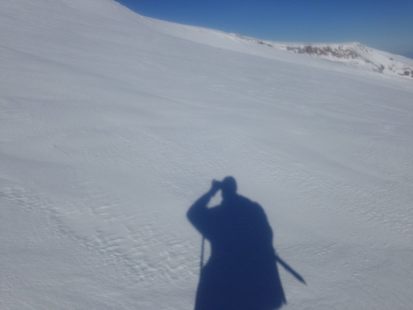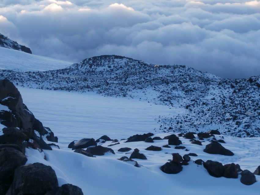 Получив по голове мы резко пригнулись, отбросили вниз ледорубы и палки, и буквально ползком начали движение вниз. Потом перебежками, сильно пригнувшись, сбросили еще метров 100. Это было бегство от грозового электричества. Благо еще шум в ледорубах и палках нас предупредил. Можно ведь было напрямую, без предупреждений, словить «дугу», и кончиться это могло