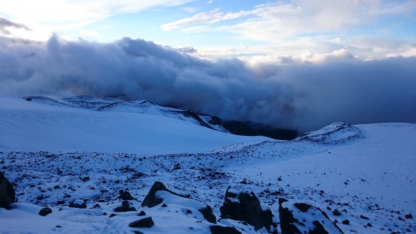 Около двух часов дня вышли к камню (4400м) чуть ниже скал Ленца. Погода в этот момент уже сильно ухудшилась. Был туман, снег. Видимость около 50 м. Мы начали пить чай, когда Дмитрий почувствовал как у него завибрировал ледоруб. Гроза спустилась до нашей отметки. Трекинговые палки тоже зашумели.