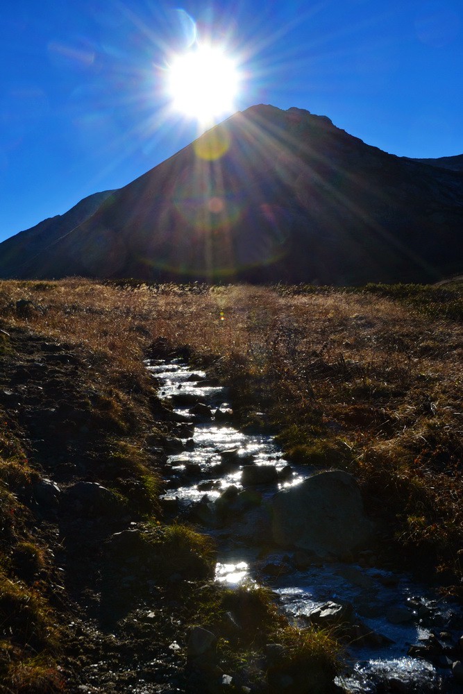 Издали видна широкая седловина перевала. Идти легко и приятно. Нет летней жары и комаров с мошками. Изредка встречаются туристы, пришедшие сюда всего лишь на один день.