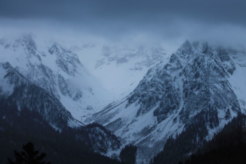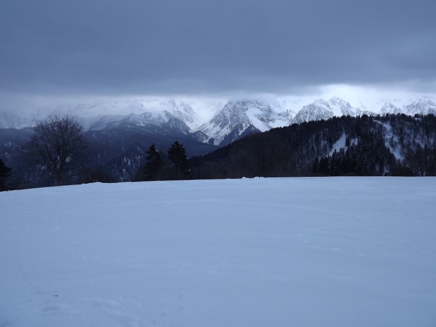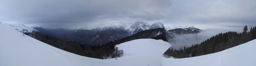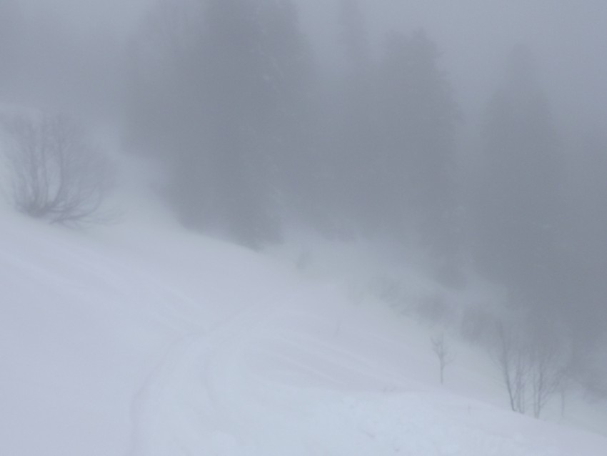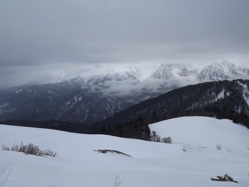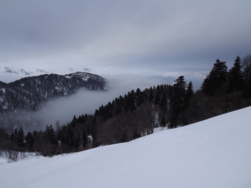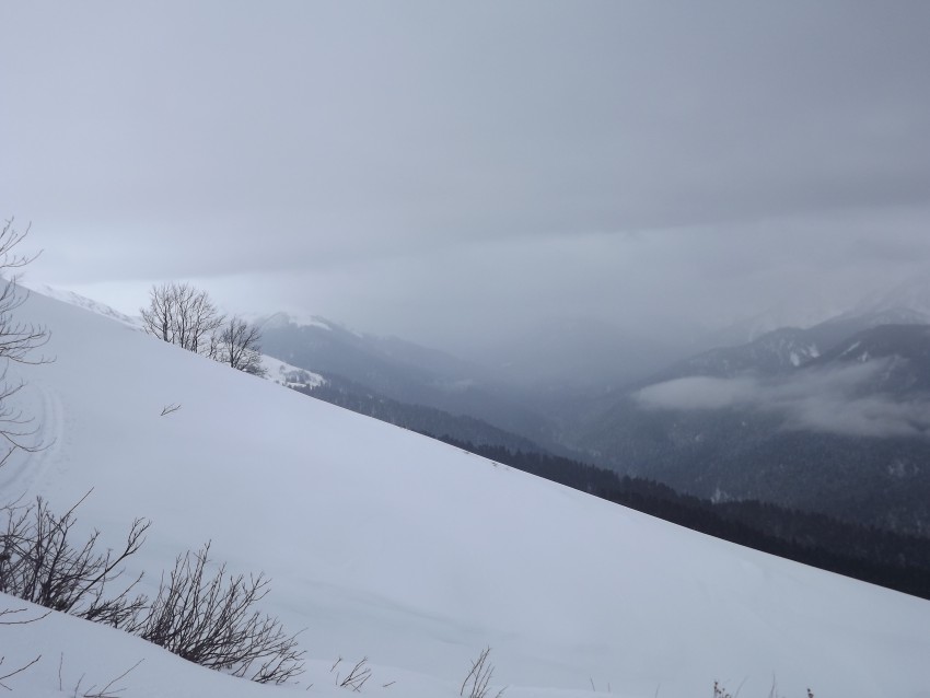 Туман ползет по ущелью Мзымты в сторону Кардлывача, но самое плохое то, что сверху все накрывает снеговыми тучами.