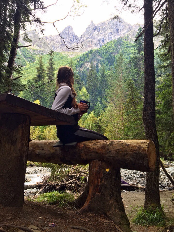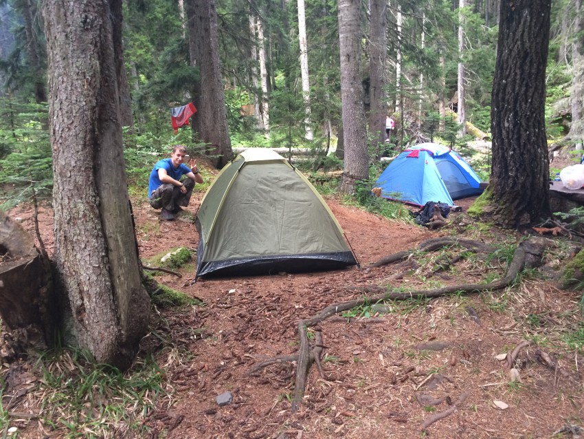 К пяти часам вечера мы были на месте. Место для стоянки на слиянии р. Малая Лаба и р. Чистая расположено в хвойном лесу и прекрасно оборудовано всем необходимым для ночёвки, построены деревянные навесы, столы и лавочки туалет, практически нет мусора. Поразило обилие белых грибов, они встречались просто на каждом шагу