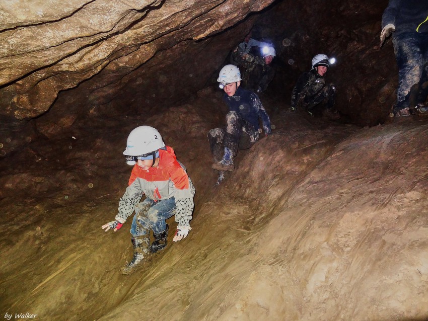 На вертикальном спуске ногами вниз нужно нащупывать ногами проход и точку опоры, при этом ни в коем случае не сгибая ноги в коленях. Иначе можно застрять, расклинившись в липкой глине. Детям здесь проще, в смысле их меньших габаритов.