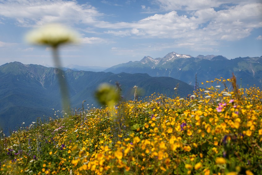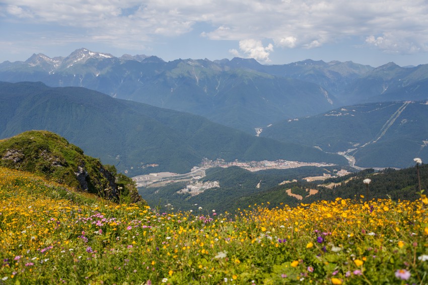 А вот сами краснополянские курорты действительно выглядят как маленькие островки у подножия гор, затерянные в пышном великолепии природы Кавказа: