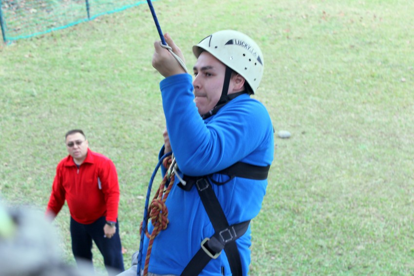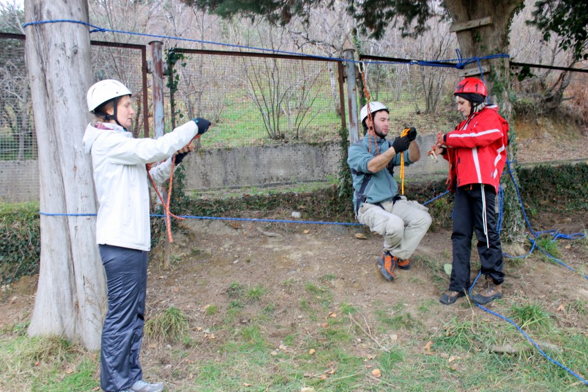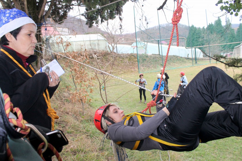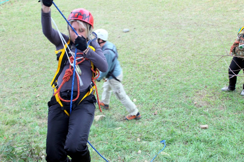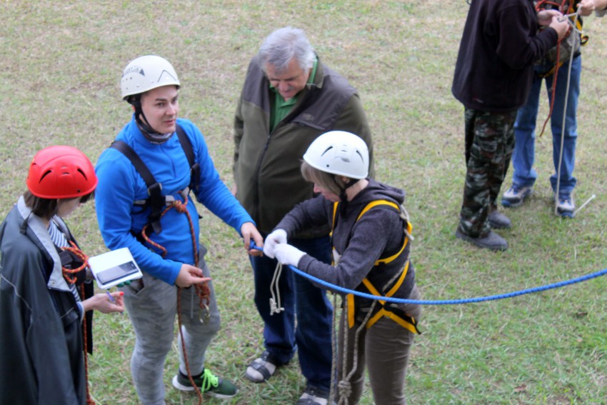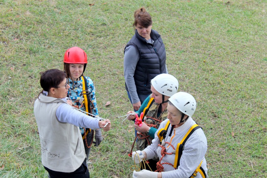 Инструктора учили новичков правильно одевать альпинистское снаряжение.