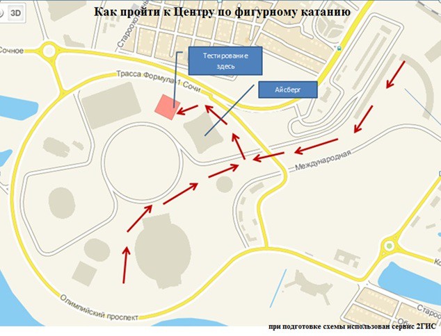 Тестирование проводится в Олимпийском парке на базе тренировочной арены по фигурному катанию и шорт-треку, где и расположен краевой Центр по фигурному катанию (пройти: по металлическому пешеходному мосту над трассой Формулы-1 у Дворца зимнего спорта «Айсберг», затем за Дворец зимнего спорта «Айсберг»). Заходить со служебного входа.