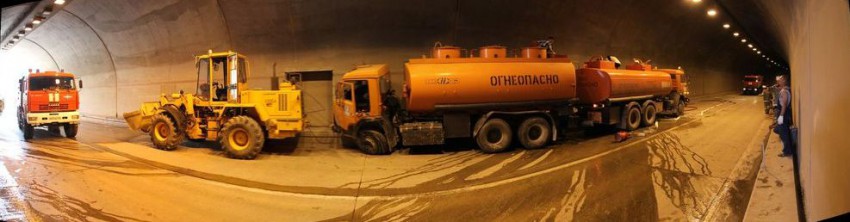 По словам очевидцев ( а также и устному частному комментарию представителя службы охраны тоннелей ) — ДТП произошло примерно в 14:30. Мы проехали тоннель в числе первых десяти авто после полного растаскивания и мойки тоннеля в 18:30… так долго «разбирали», потому что с бензовоза солярку откачивали…