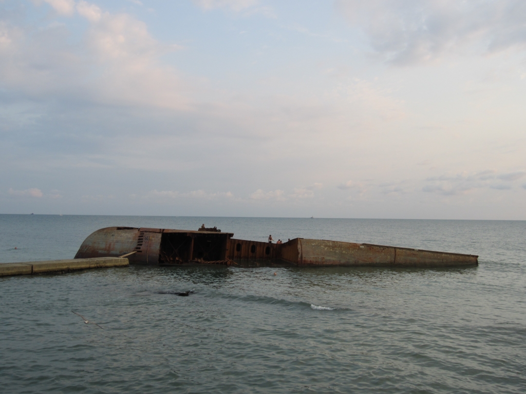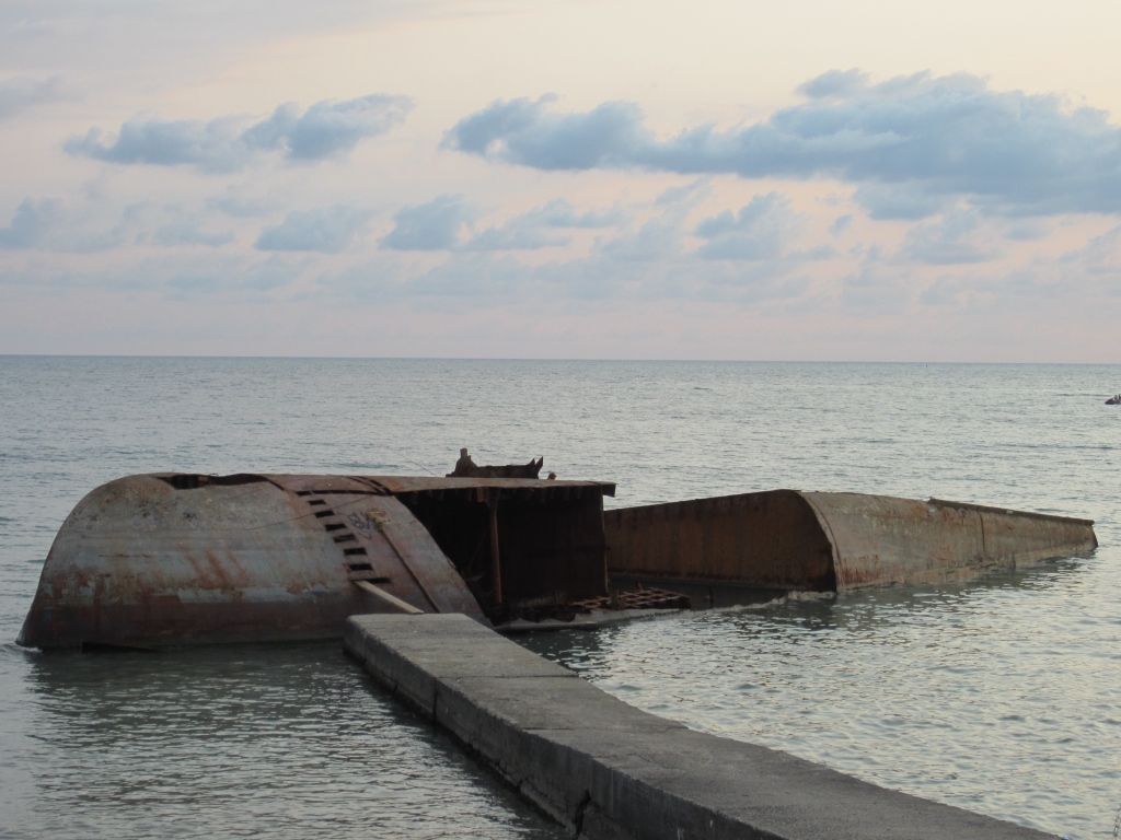 В ту ночь был сильный шторм и корпус сухогруза «Aras» не выдержал. Не буду вспоминать подробностей, об этом кораблекрушении тогда много говорили, писали, снимали и рассказывали. Буквально у каждого наверное есть фотка на мобильном или камере на фоне новой достопримечательности в центре города. Вкратце, кораблик разломало пополам, жертв нет. Часть затонула за морпортом, часть выкинуло на берег напротив ресторана «Тинькофф». Причина — вроде как «срок годности» несовместимый с силой шторма =)