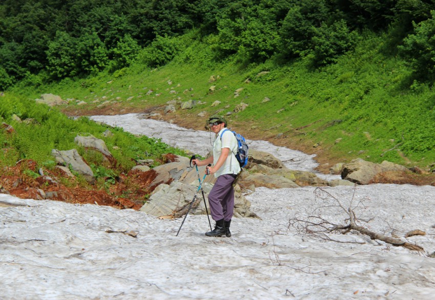 В июне 2009 г. довелось съездить с экскурсией на . Можно было и самостоятельно доехать на общественном транспорте, но не стали ломать голову и отправились на экскурсионном автобусе. Как обычно, снача нас завезли на пчёлохозяйство и все продегустировали мёд. Потом этот мёд покупали желающии. Поехали дальше по Кранополянскому шоссе. С правой стороны сверкала Мзымта. Впереди белели снежные вершины. Доехали до подъёмника Альпика-Сервис. Тут произошло разделение. Кто-то отправился на подъёмник, а мы поехали к озёрам Хмелевского. Изрядно потряслись по горной дороге и через час с небольшим достигли пункта назначения. Картину такую никто увидеть не ожидал. Снег и озерцо покрытое льдом. Сюрреализм. Некоторые кадры остались от этой поездки.