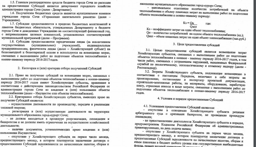 Интересное постановление № 2612 было подписано 18.11.2016г Главой г. Сочи А.Н. Пахомовым. В нем речь идёт «Об утверждении Порядка предоставления юридическим лицам (за исключением государственных (муниципальных) учреждений), индивидуальным предпринимателям, физическим лицам субсидий на возмещение затрат, связанных с выполнением работ по подготовке объектов теплоснабжения к осенне-зимнему периоду 2016-2017 годов»