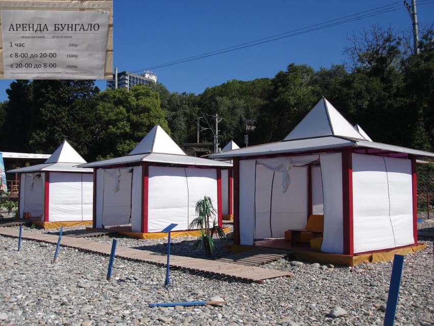 Бунгало на городском пляже в Кудепсте стоит дороже квартиры на сутки. Без сортира, душа и кухни, зато кальян есть.