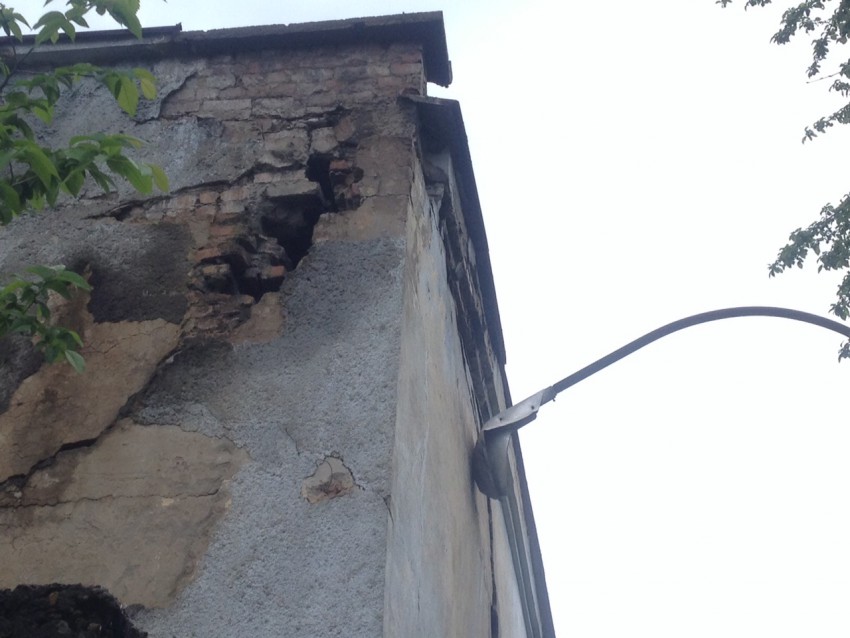 Фонарь освещения подпирает разрушающуюся стену старой котельной. Согнулся, бедный, но еще держится!..