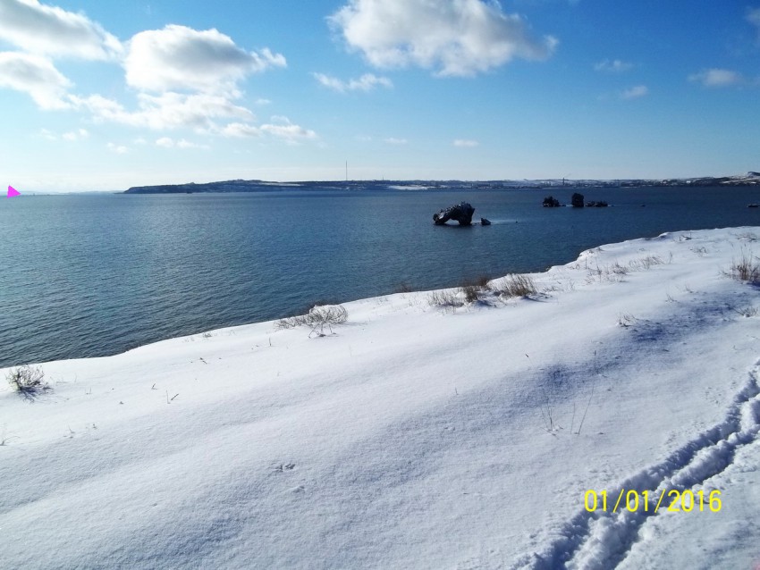 Снег в Керчи. Слева, где маркер, коса Чушка и кавказский берег. Там забивают сваи моста. В Керчи прекрасно слышно. С новым счастьем!