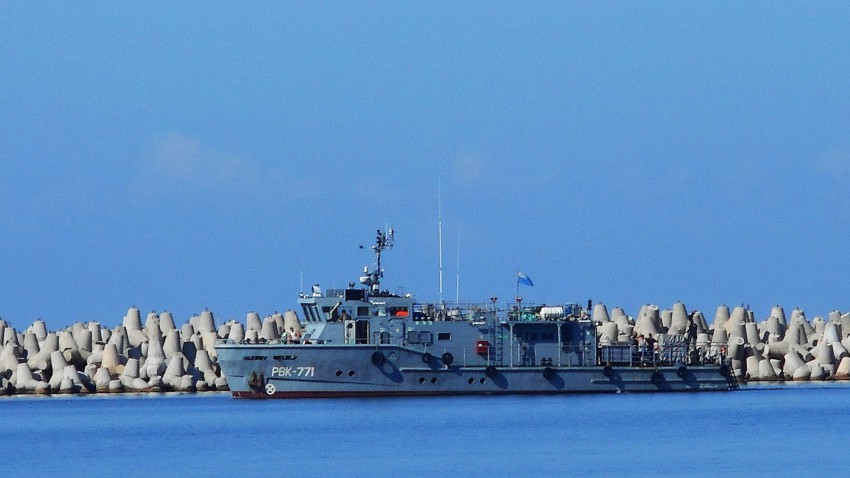 «Убийца крейсеров, авианосцев». Шутка. Это военный водолазный катер проверяет состояние ограждения нового порта.
