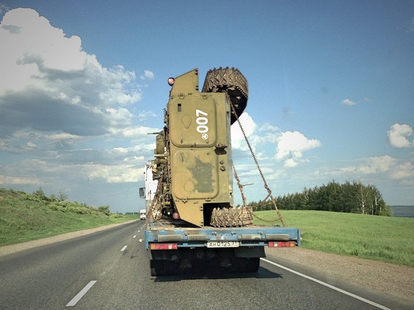 Один из наиболее интригующих методов перевозки вежливой техники цвета хаки по дорогам общего пользования.