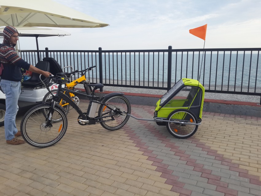 Первый раз видел велик с таким прицепом! Он еще и электрический-около 30 км на одной зарядке