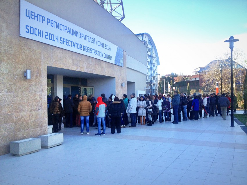 Центр регистрации зрителей в Мандарин в Сочи очередь снаружи 68, внутри около 200, работает 3 окна, одна очередь на все.