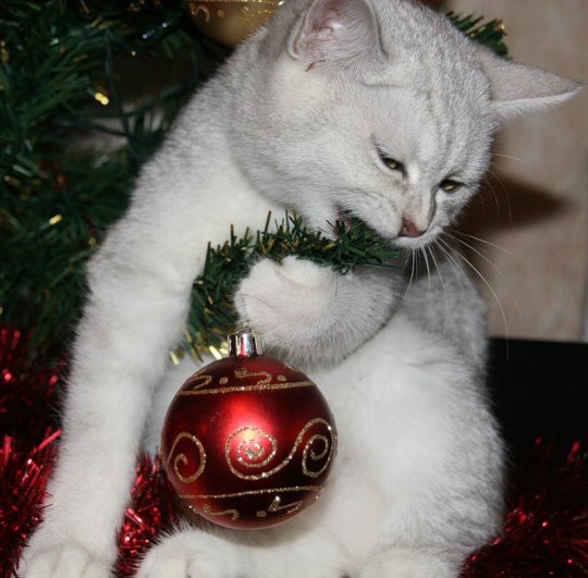С каким удовольствием могут забраться на ёлку, пытаться попробовать ветки ёлки, шебуршать подарочной бумагой и даже перевернуть ёлку :))