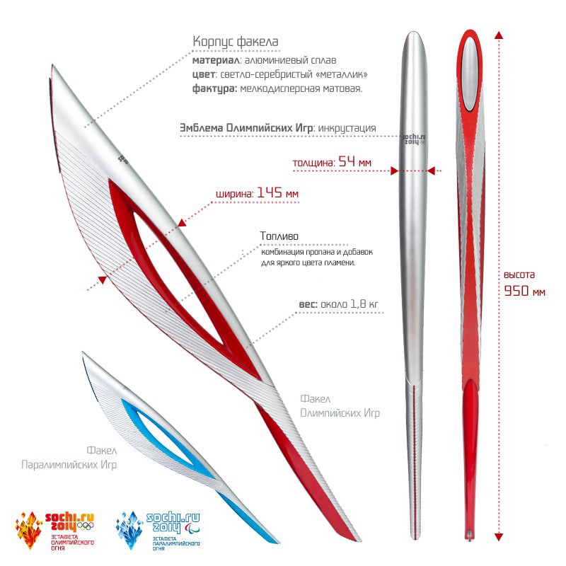 свернуть / развернутьОлимпийский и паралимпийский факелы одинаковы по форме и размеру, отличаются лишь цветом: олимпийский — в традиционном для российского спорта красном, паралимпийский — в небесно-голубом, символизирующем силу и дух паралимпийского движения. По форме факел напоминает перо жар-птицы, знакомая с детства любому жителю России по сказкам.
