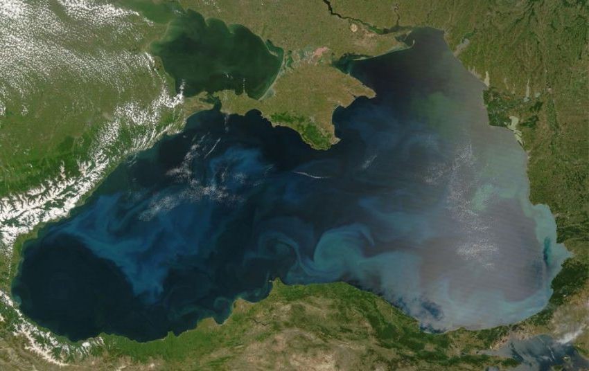 фото из космоса.Красочное цветение фитопланктона (часть планктона, который может осуществлять процесс фотосинтеза) по всему Черному морю вблизи турецкого города Синоп и Самсун.