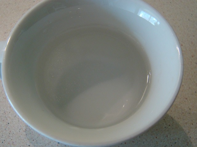 Господа, ну вот, не поленилась и по советам выше, вскипятила вчера воду из-под крана и на ночь оставила. Утром слила ту, что сверху, а остаток в чашку. Вот она: