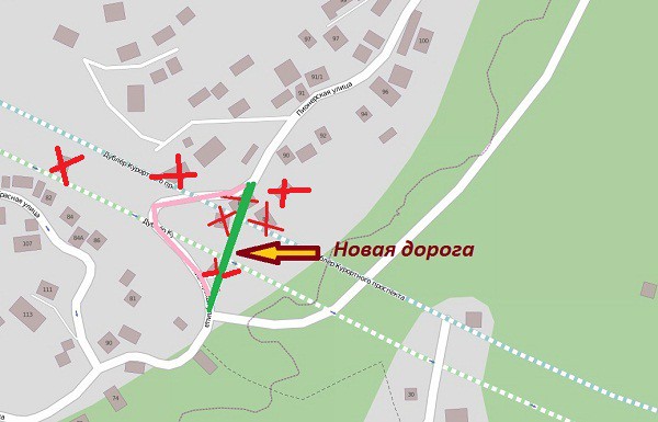 Лучше так, вот скриншот. Красные кресты снесённые дома. Дорога отмеченная розовым маркером, старая несуществующая дорога. Зелёным маркером обозначена новая дорога, пока не работает, можно только пешком.