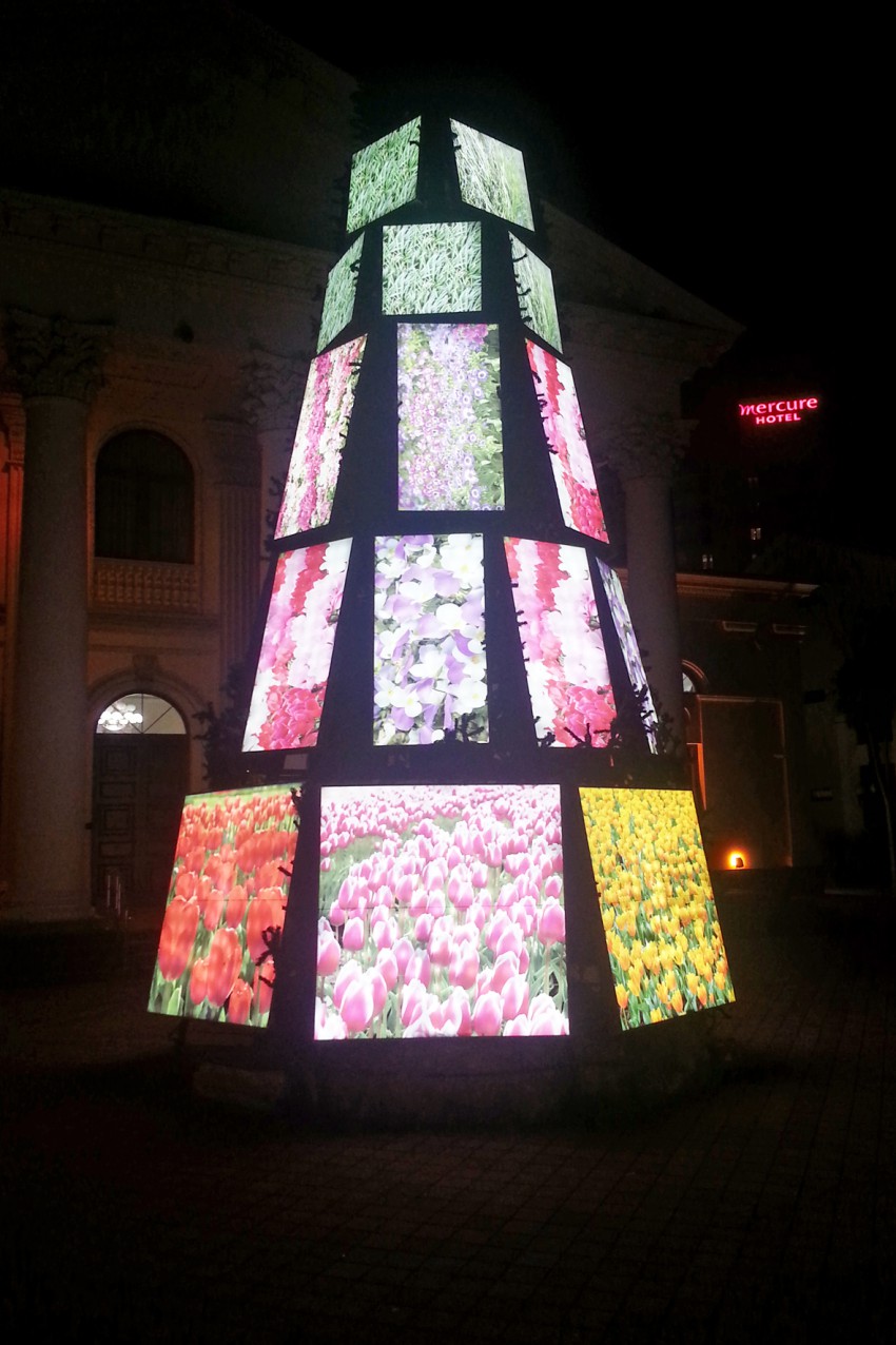 Инновационный подход к оформлению елки, само название близлежащих социальных объектов определяет, и как бы, подталкивает к таким экспериментам. Так, елка оформлена в стиле современного искусства, находится близ площади искусств. Под впечатлением от названия кинотеатра — Стерео, на елке были размещены в качестве игрушек светящиеся экраны. Само строение елки — конус. Экраны, размещенные на данном типе геометрической фигуры призваны создавать стерео-эффект. Я думаю это одна из наиболее свежих идей Баранской, что несомненно говорит о ее высоких профессиональных качествах. Жаль, что большинство жителей города слишком «серы» для таких инноваций в дизайне. Не сомневаюсь, что в новогодние каникулы отбоя не будет от желающих сфотографироваться у этой ели.
